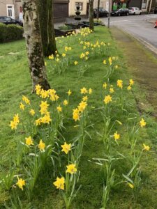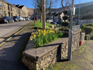 Last November we included on our news pages photos and information on the children of Blaengarw Primary School who had braved wind and rain (and a little sunshine) to plant daffodil bulbs supplied by the Garw Valley Community Council; planted them on the Strand.